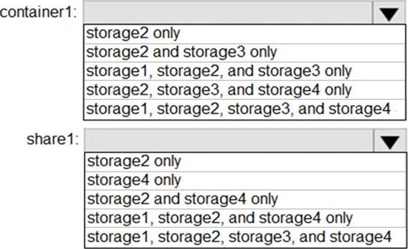 Which storage accounts should you use for each resource? To answer, select the appropriate options in the answer area. NOTE: Each correct selection is worth one point.