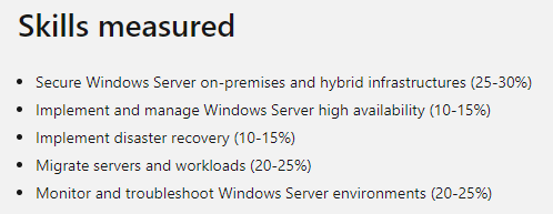 AZ-801 Configuring Windows Server Hybrid Advanced Services (beta) is mainly for candidates to configure advanced Windows Server services using on-premises, hybrid, and cloud technologies. A candidate for AZ-801 exam should have extensive experience working with Windows Server operating systems. Additionaly, they should have expertise in implementing and managing on-premises and hybrid solutions, including performing tasks related to security, migration, monitoring, high availability, troubleshooting, and disaster recovery. They use administrative tools and technologies, such as Windows Admin Center, PowerShell, Azure Arc, Azure Automation Update Management, Microsoft Defender for Identity, Azure Security Center, Azure Migrate, and Azure Monitor.