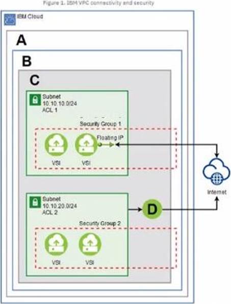 3. Which component is represented by letter D in the displayed IBM VPC connectivity and security diagram?