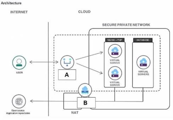 6. Which component is represented by the A in the image of the web application architecture?