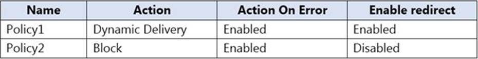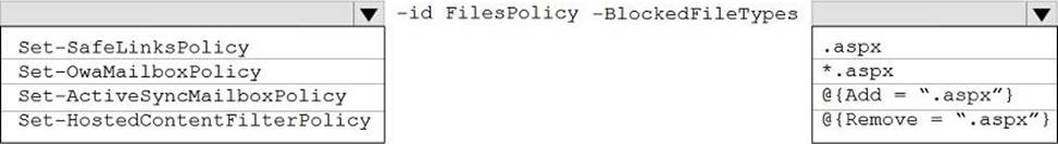 ✑ Configure FilesPolicy to prevent Outlook on the web users from downloading attachments that have the ASPX extension.