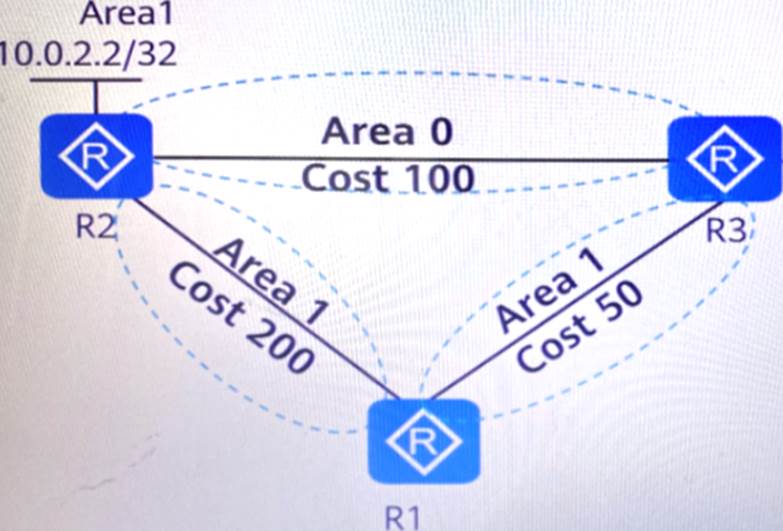 3. As shown in the figure, the cost value of the link that all interfaces of the router enable OSPF is identified in the figure. Loogback0 interfect of R2 is advertised in area 0. In area 1, both R2 and R3 will be transmitted in the form of Typae3 LSA 10.0.2.2/32 routing information.