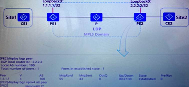 10. As shown in the figure, MPLS/BGP IPVPN is deployed in the network. The MP-BGP neighbor relationship is established between PE1 and PE2 through the LoopbackD interface. After the configuration is completed, it is found that CE1 and CE2 cannot learn routes from each other. Use the command on PE2 to query neighbor information as shown in the figure. What is the most likely cause of the problem?